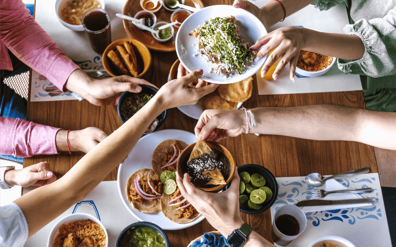 Mexican rice, refried beans, flour tortillas, guacamole, sour cream, pico de gallo.